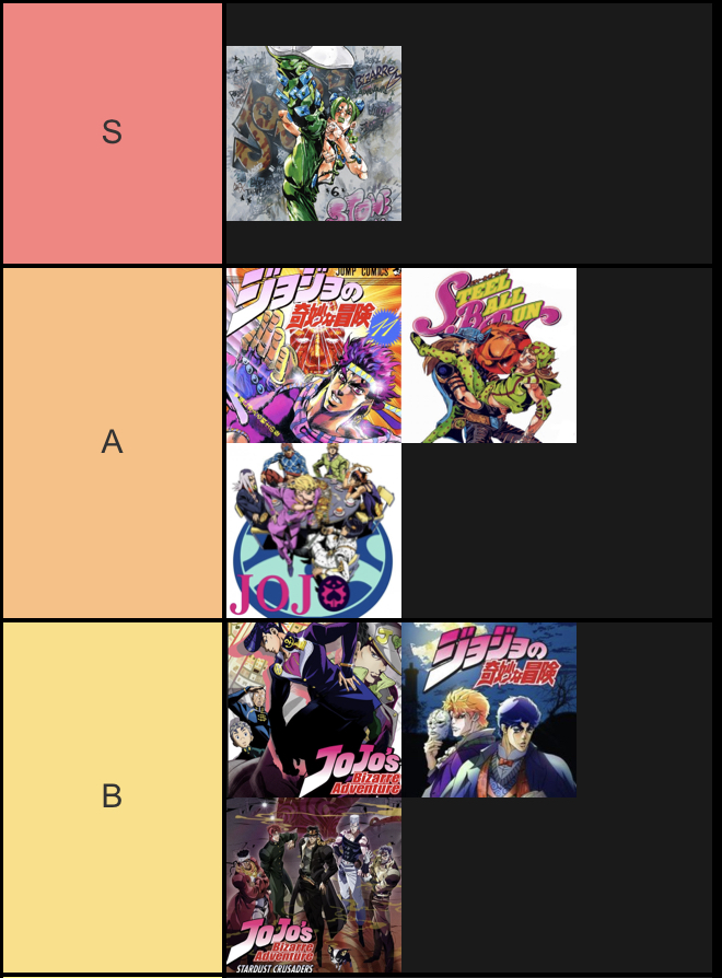 Share your tier list. This thread is archived. Edit the label text in each row. There is no point in having more than 100 worthiness as bumping up tiers. Check out other jojo parts tier list recent rankings. This article lists every stand to appear so far in jojos bizarre adventure and related media.