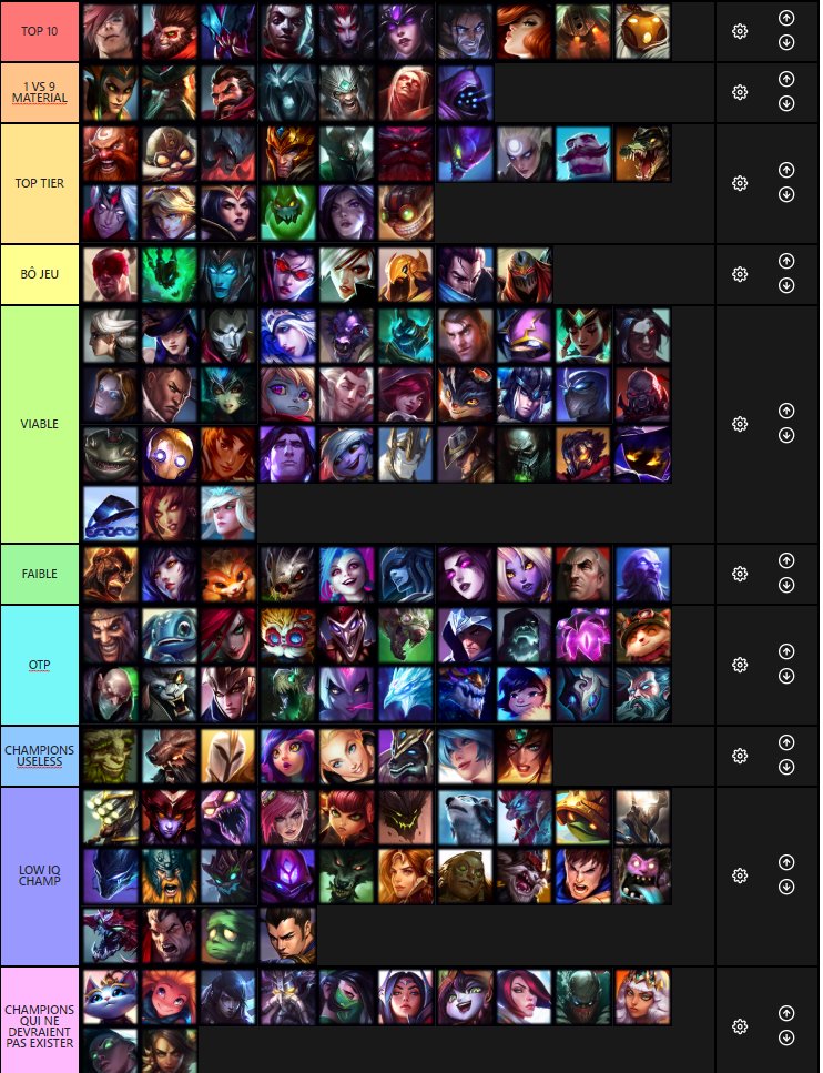 Use this lol tier list to find out the current best solo queue league of legends champions based on data from the best players. Use the champion tier list on proguides to find win rate pick rate ban rate and play rate. They will be ranked as optimal s tier great a tier or good b tier by their overall climbing potential and as intense hard a new addition moderate or simple according to the difficulty of utilizing their movesets mechanics to the highest level. If you have any questions about our choices or process ask us on discord. Sort by win rate tier role rank and region. Best champions based on millions of league of legends matches.