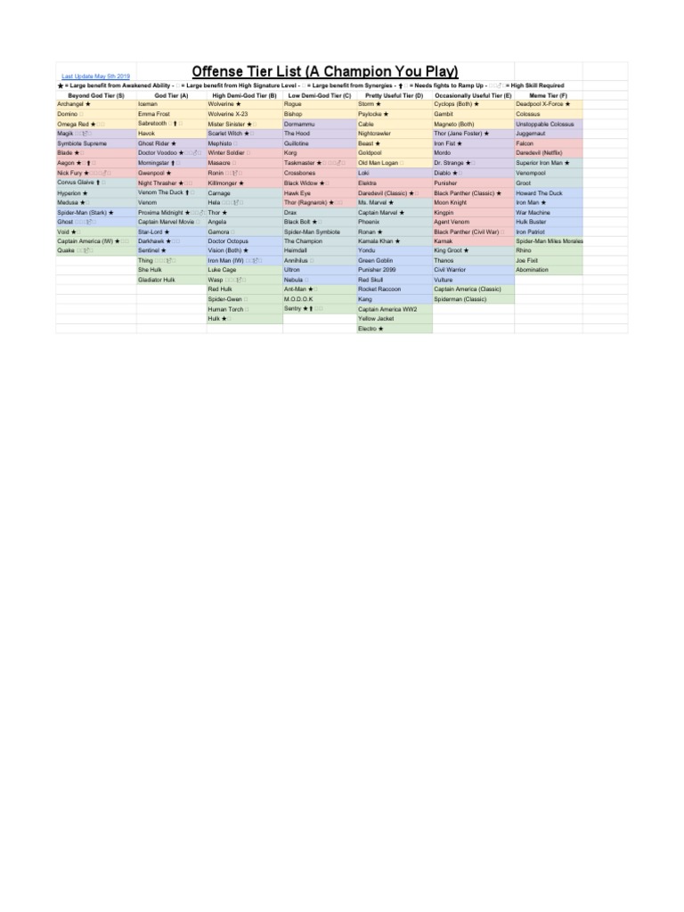 Offense tier list offense tier list is totally based on attack champs and useful for personal progress in game. Marvel contest of champions mcoc champs offense tier list divided into different categories the best tier champs to add to your attack team people also know them as god tier champions champions with sign is available as 4 star only and you can max them out. Here champs are divided into beyond god tier god tier demi god tier mid tier low tier and bottom tier. You could argue moving one up or one down with way but theyre pretty similar power levels. Wolverineweapon x deadpool both scarlet witch gamora miss marvel visionaou war machine. Champs available list.