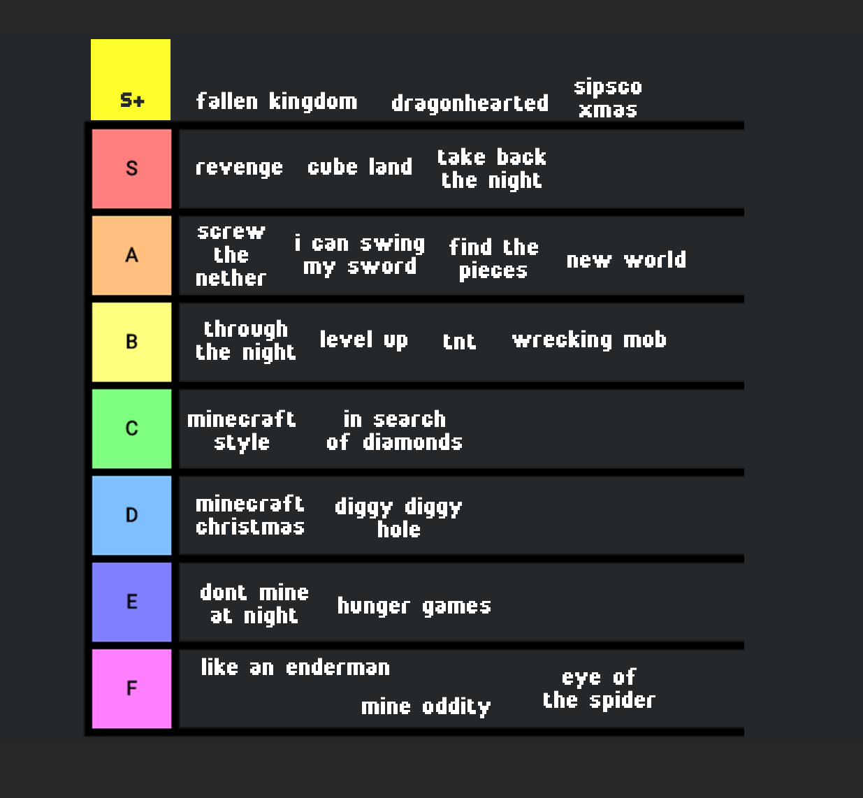 Minecraft song tier list. Find the best minecraft servers with our multiplayer server list. First off mine oddity is easily ss tier. 0118 how to play minecraft pocket edition hunger games. Hunger games deserves better. 2700 minecraft 114 my tier list of farms. Secondly this will always be my favourite minecraft song.