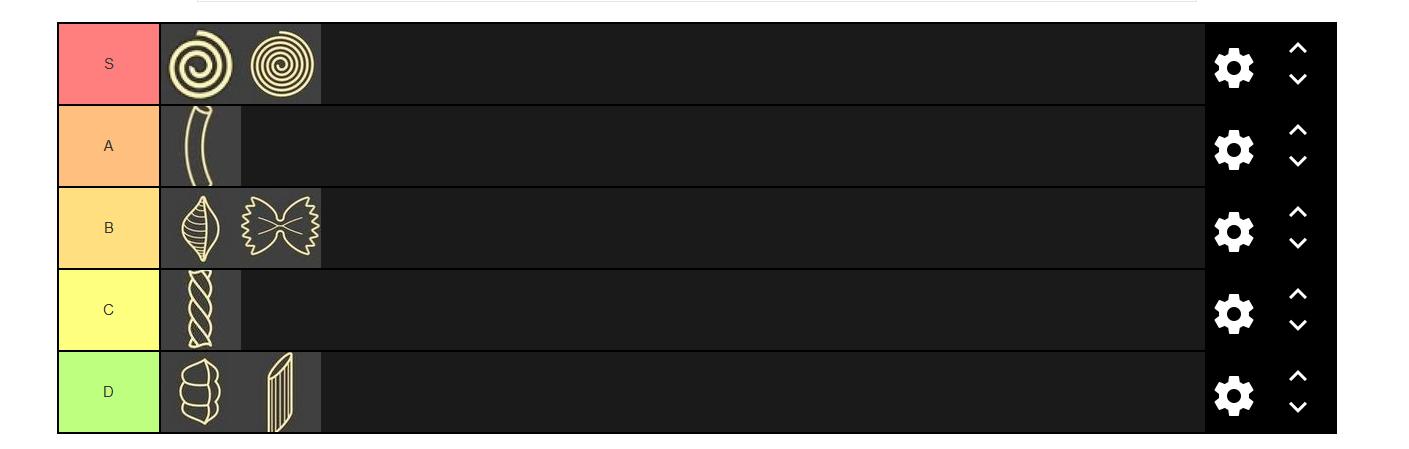 Pasta tier list maker. If you want to read detailed reviews before buying pasta maker then scroll down below. Well let me give you a brief introduction to the topic. A shortlist of top 10 best pasta maker machines of 2019 with discount links right below to buy and enjoy tasty homemade pasta with your family and friends. Edit the label text in each row. Share template on twitter share template on facebook. Click savedownload and add a title and description.